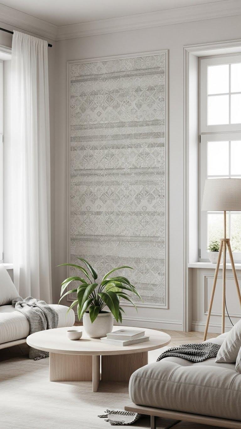 Framed by simple molding, a patterned neutral wallpaper turns one wall into a quiet focal point that anchors the room without shouting for attention. You’ll choose subtle geometric florals or textured stripes to add movement and calm, pairing the accent with minimalist furniture and open sightlines. The result feels liberating: a composed backdrop that invites rest and personal expression without constraint.