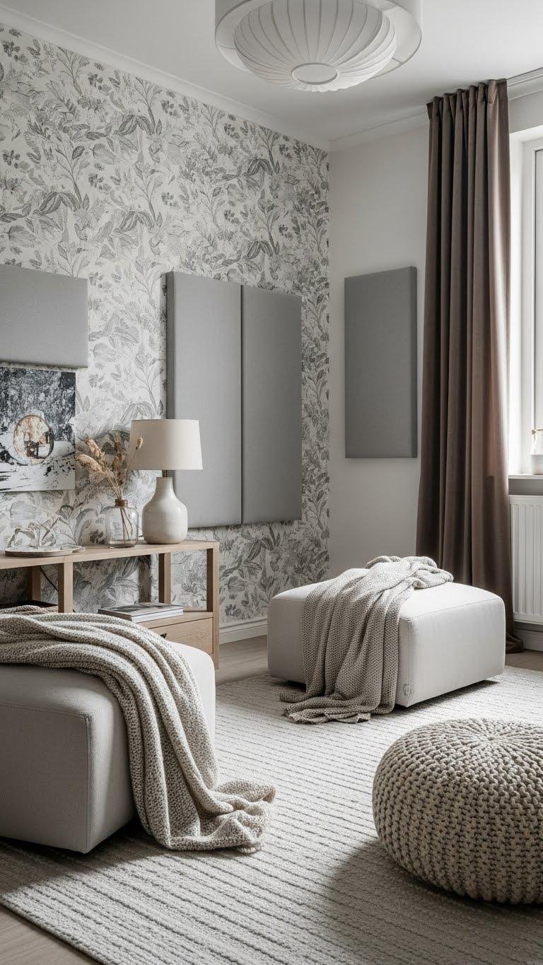 After the patterned wall sets a gentle focal point, bring in sound‑softening fabrics and heavy drapes to deepen the room’s hush. You’ll layer textured rugs, linen throws, and velvet curtains; place acoustic panels unobtrusively for quieter evenings.