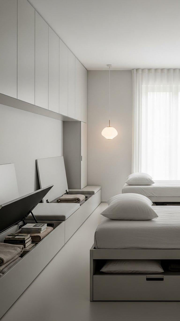 When you keep surfaces clean and lines simple, the room feels airy while everything still has a place to disappear into; built-in benches with lift-up lids, low-profile storage beds, and seamless wall cabinets let you stash blankets, books, and extra pillows out of sight.