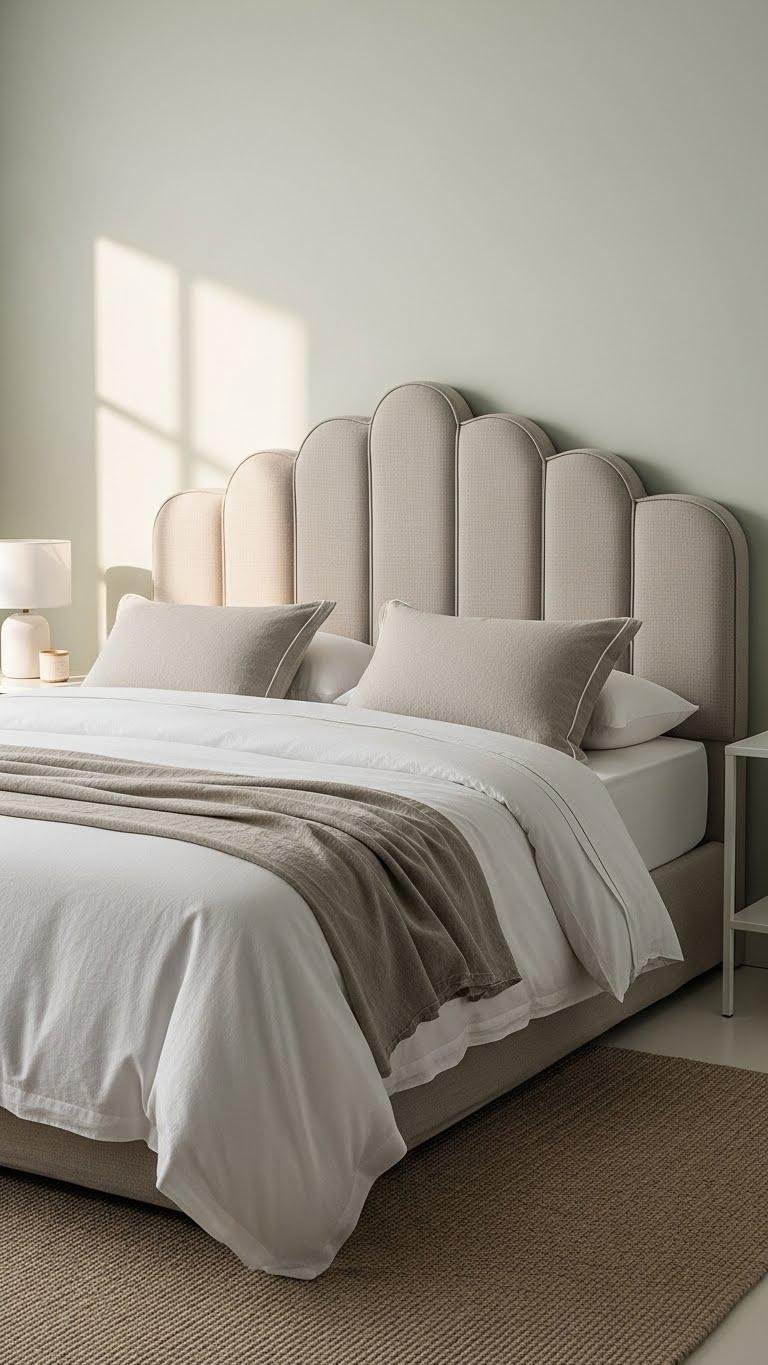 Shift from the low, grounded platform to a softer vertical accent by introducing a scalloped headboard in linen — it keeps the room calm while adding a gentle, rhythmic silhouette. You’ll enjoy linen scallops that catch light, subtle piping that defines each curve, and a curved silhouette that feels freeing. A tufted backing offers supportive comfort, inviting restful nights without visual clutter.
