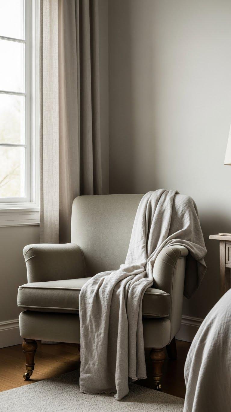 Bring in a velvet accent chair in muted tones to anchor a neutral bedroom and add a soft, tactile focal point. You’ll choose a velvet armchair in dove gray or muted moss, its vintage silhouette suggesting relaxed elegance. Position it near a sunlit corner for reading, layer a linen throw, and let the piece offer quiet comfort and liberated calm without overpowering the serene palette.