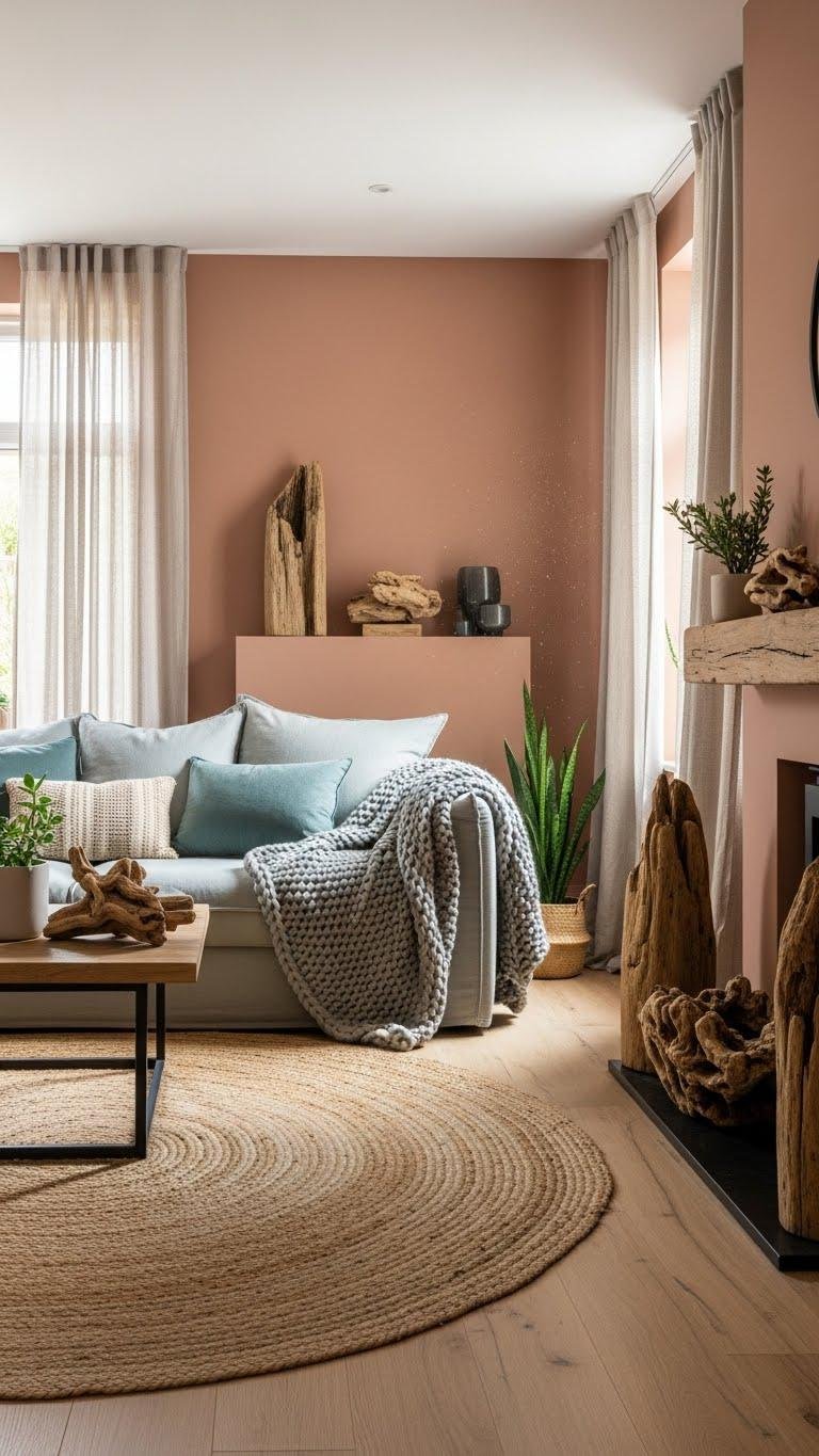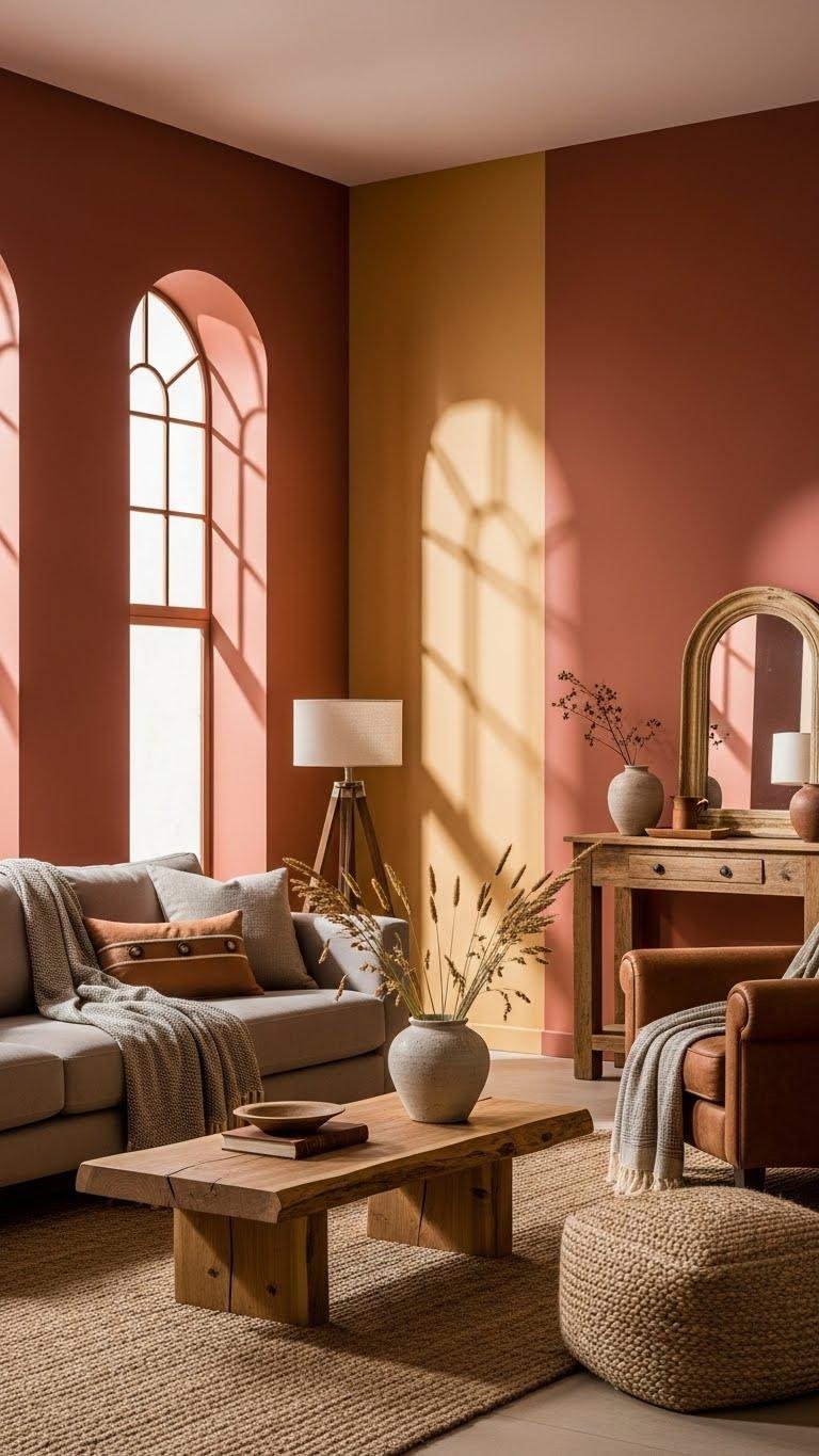 Start with a base of warm earthy neutrals—think terracotta, ochre, soft taupe, and clay—to give your rooms an inviting, grounded feel.