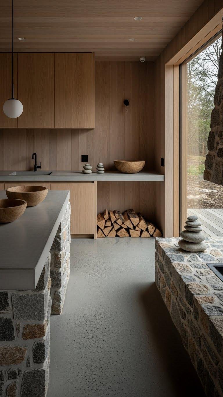 You’ll layer textured concrete countertops, a raw hearth, or a matte concrete floor for minimalist strength. Introduce riverstone accents—bowls, trays, or stacked pebbles—to soften edges and connect you to nature. These elements keep the palette calm while freeing your space to breathe.