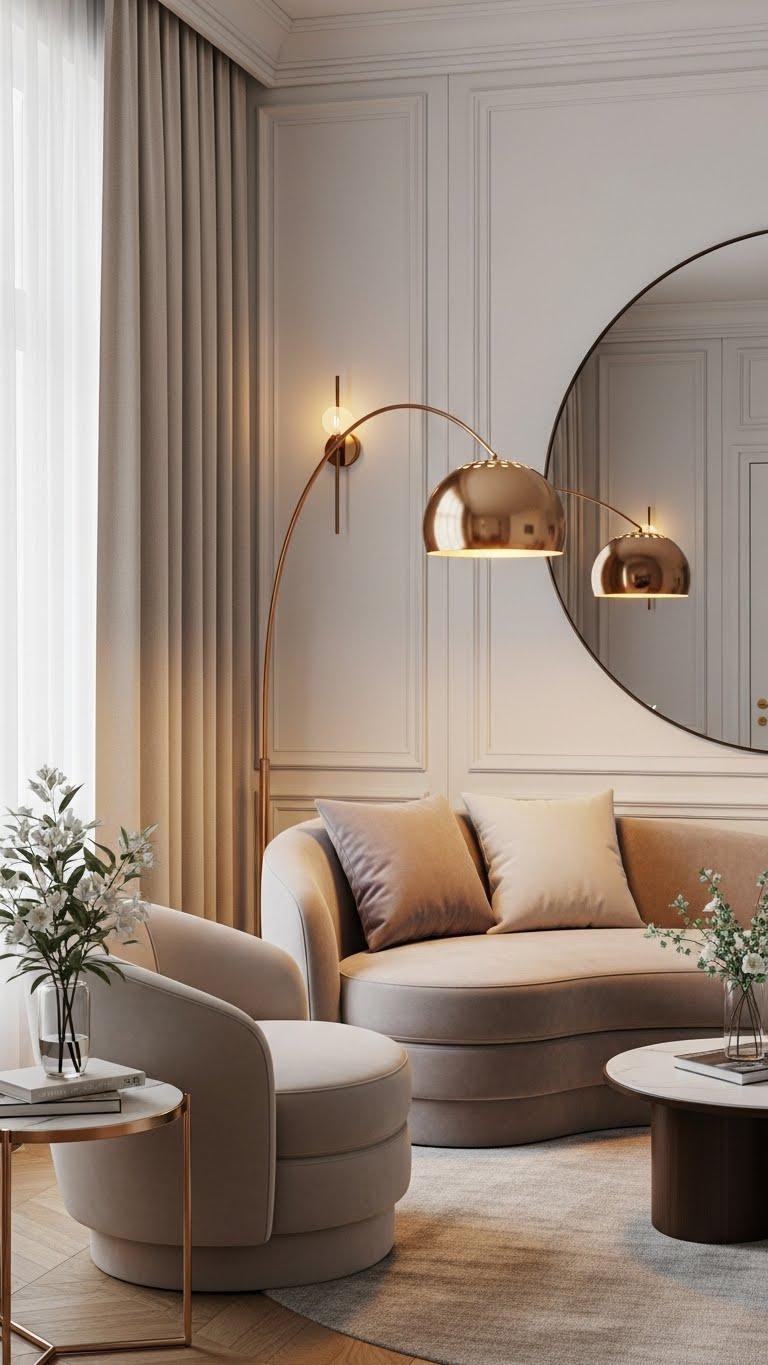 Although rooted in the warm neutrals you’ve established, introducing frosted silver and pale lilac will lift the palette with a cool, sophisticated breath—use silver finishes and muted lilac textiles to add crisp contrast without disrupting the room’s calm.