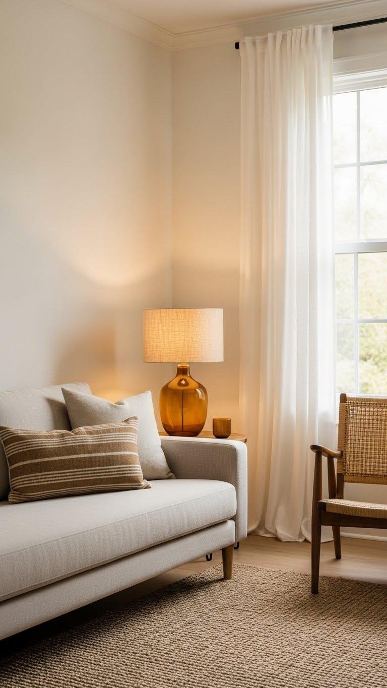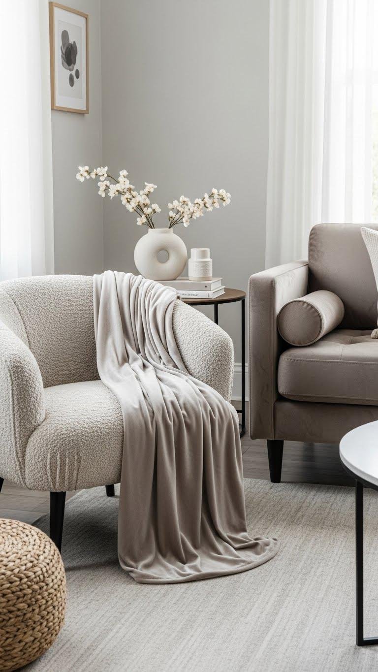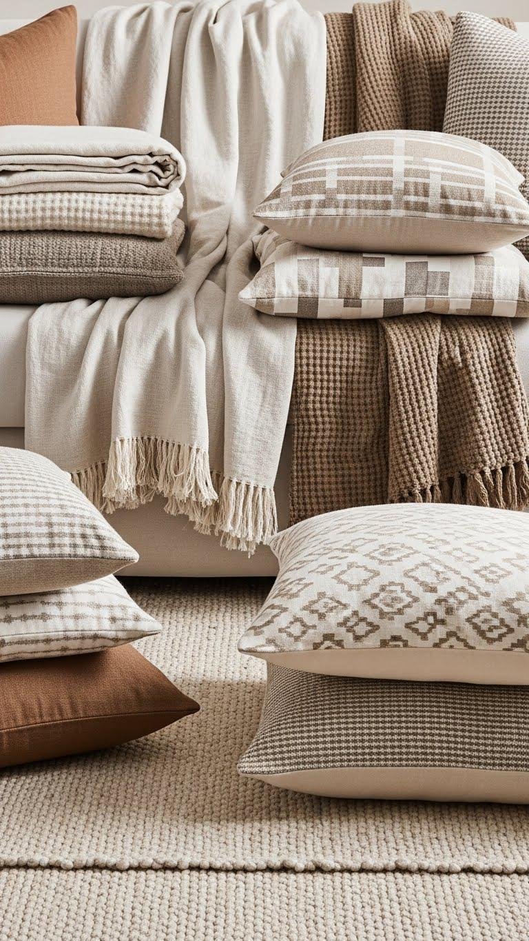 You’ll mix linen layers and textured rugs, add tonal throws over seating, and pair soft cushions in cream, taupe, and mushroom.