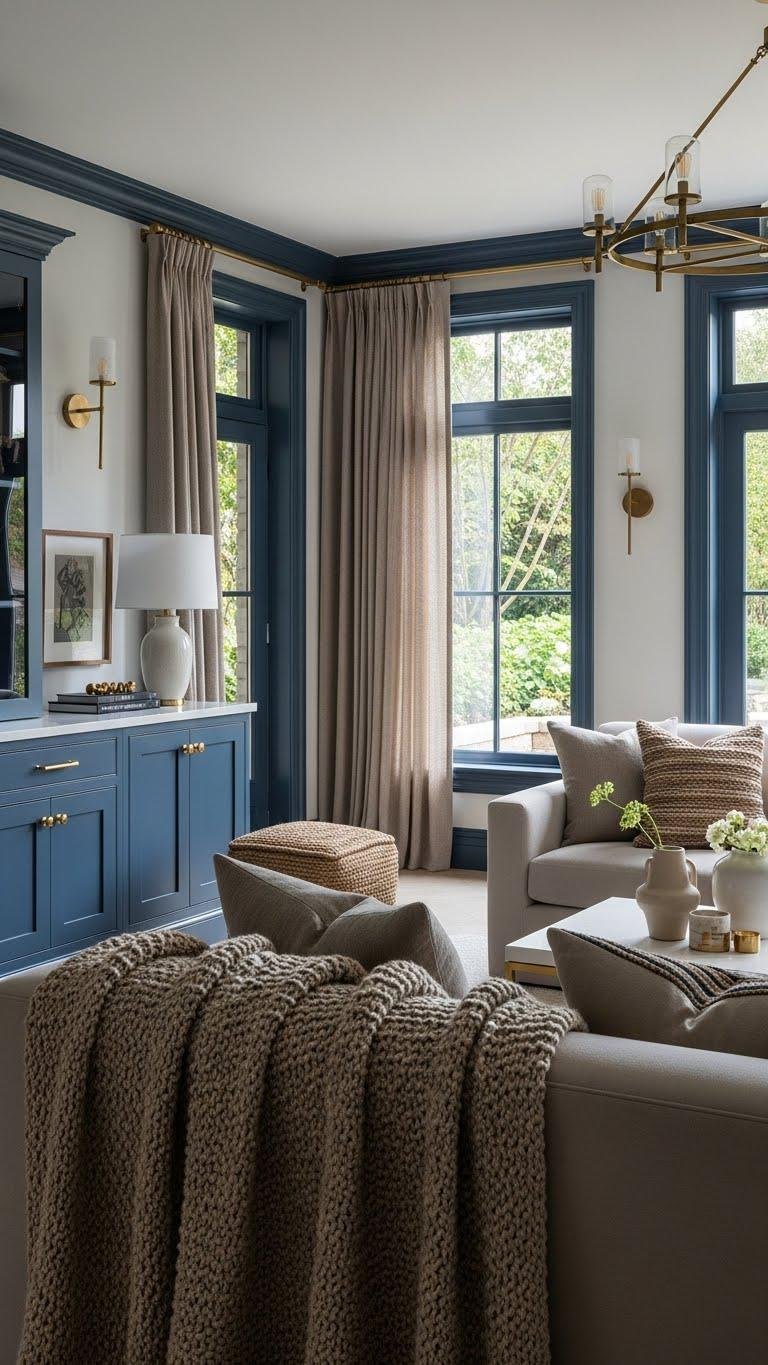 Choose matte navy fronts or subtle lacquer finishes for depth. Paint navy trim to frame vistas and create cohesion. Let brass hardware add restrained warmth and contrast.