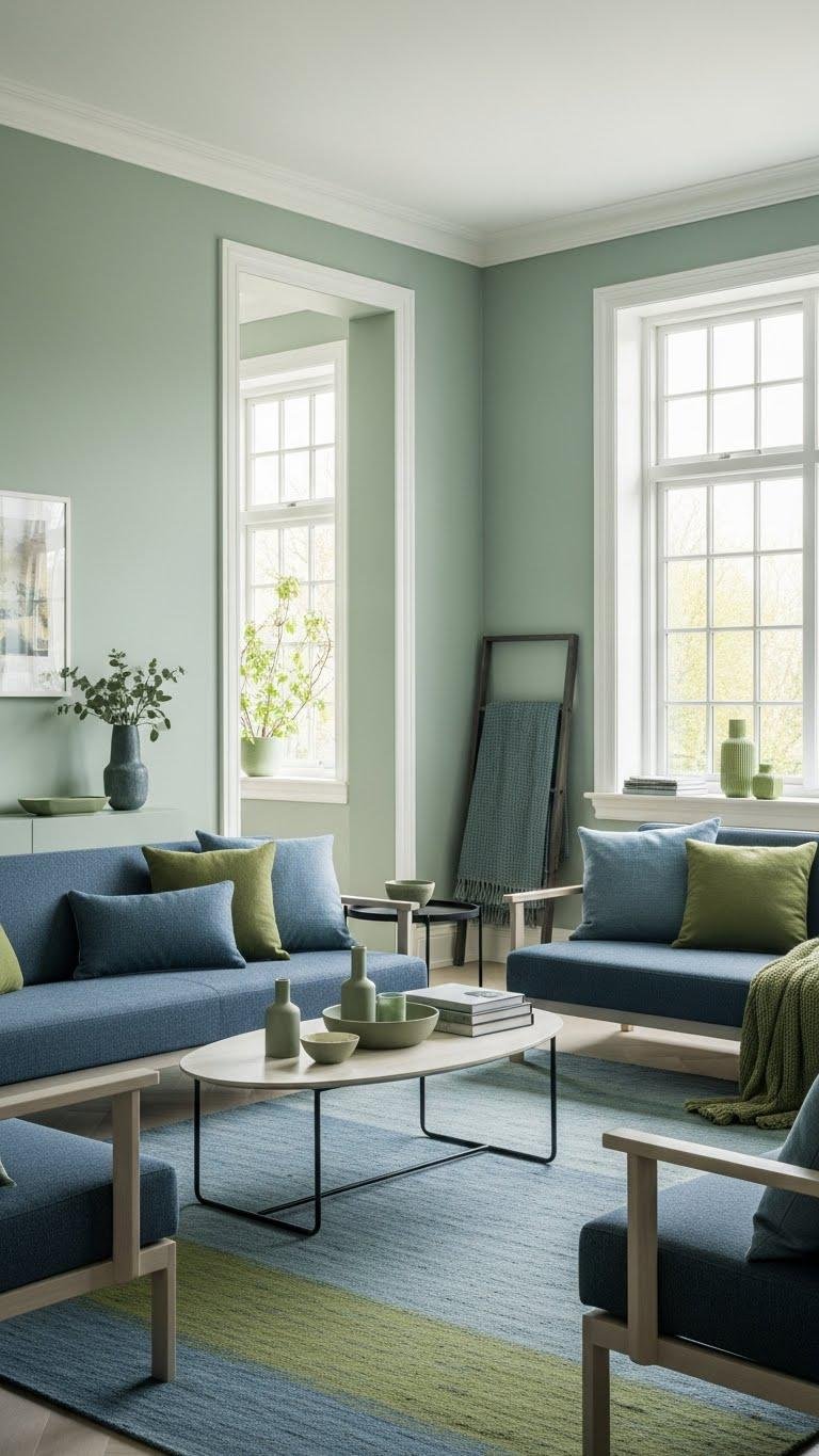 Pairing blues with muted greens creates a serene, layered palette that feels both crisp and organic. You’ll blend coastal sage walls with denim moss accents—throw pillows, rugs, or trim—to evoke open air and calm.