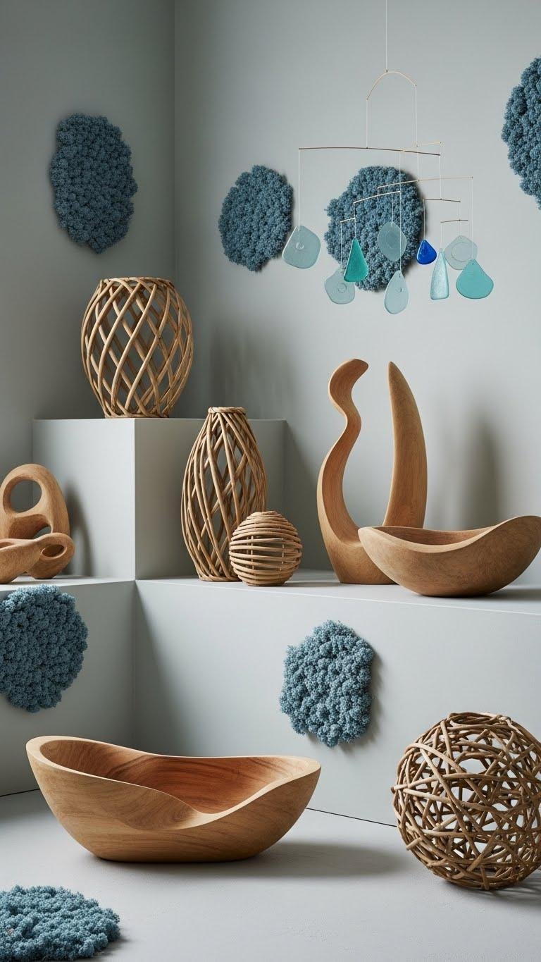 If your room already breathes with coastal sage walls and denim moss accents, bring in sculptural organic accessories to give the palette tactile presence and quiet movement.