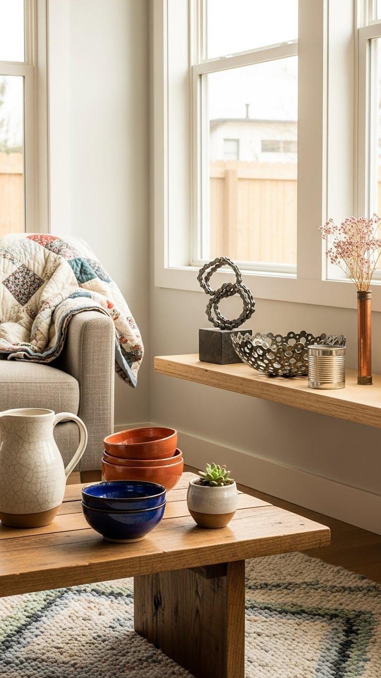 You’ll curate a calm, liberated space with handmade ceramics and small batch pottery, pair reclaimed textiles for tactile warmth, and introduce character via upcycled metals. These choices honor craft, reduce impact, and free your home from excess.
