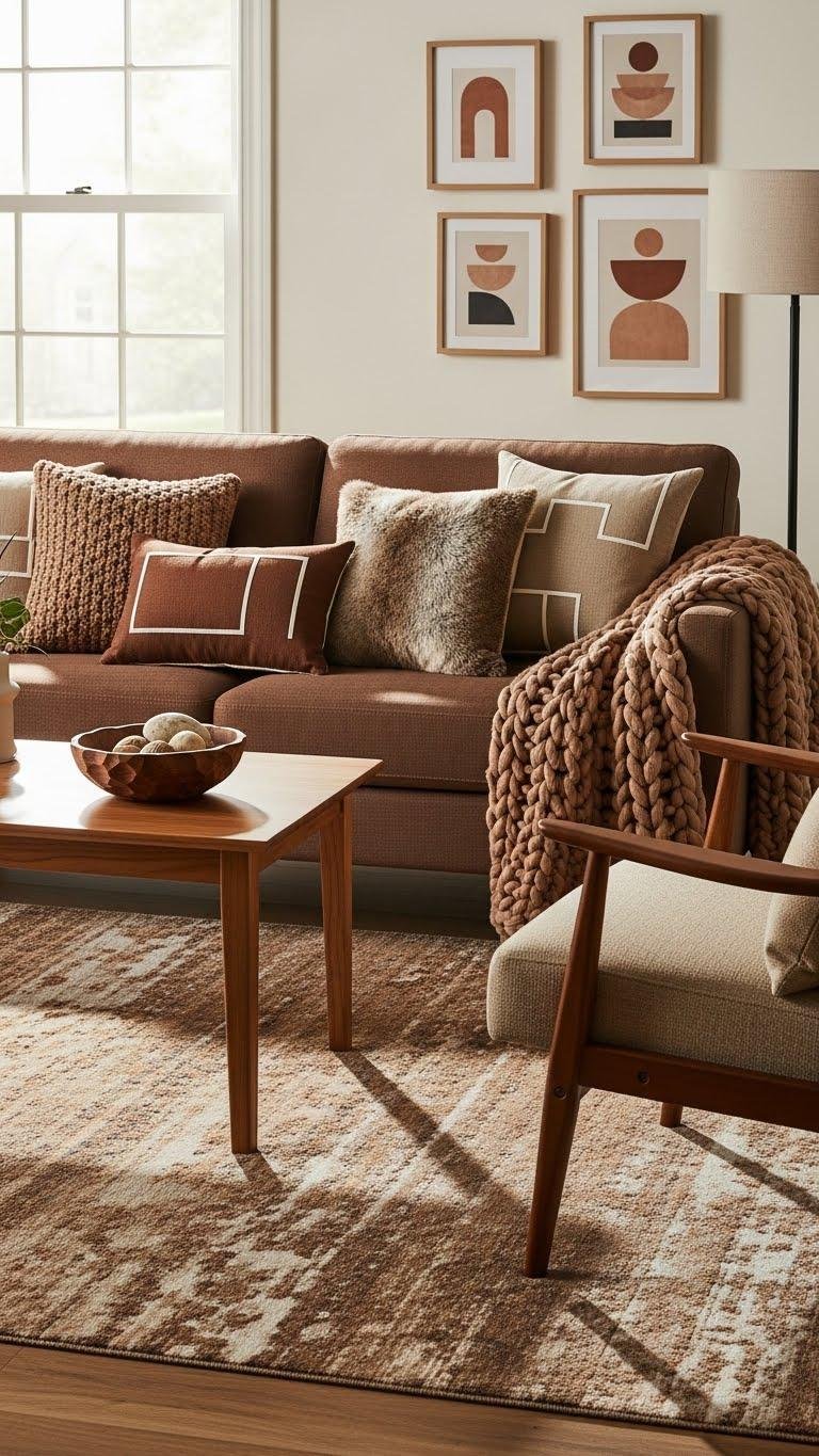 Layer mid-tone browns throughout a room to give it subtle depth without overpowering a neutral scheme. You’ll use mid brown layering on textiles, wood furniture, and rugs to create warmth and cohesion.