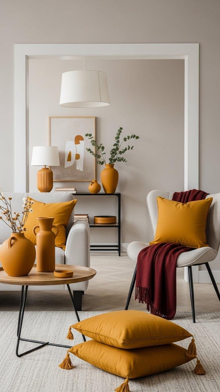Introduce ochre and oxblood sparingly to warm a neutral scheme without stealing the show.