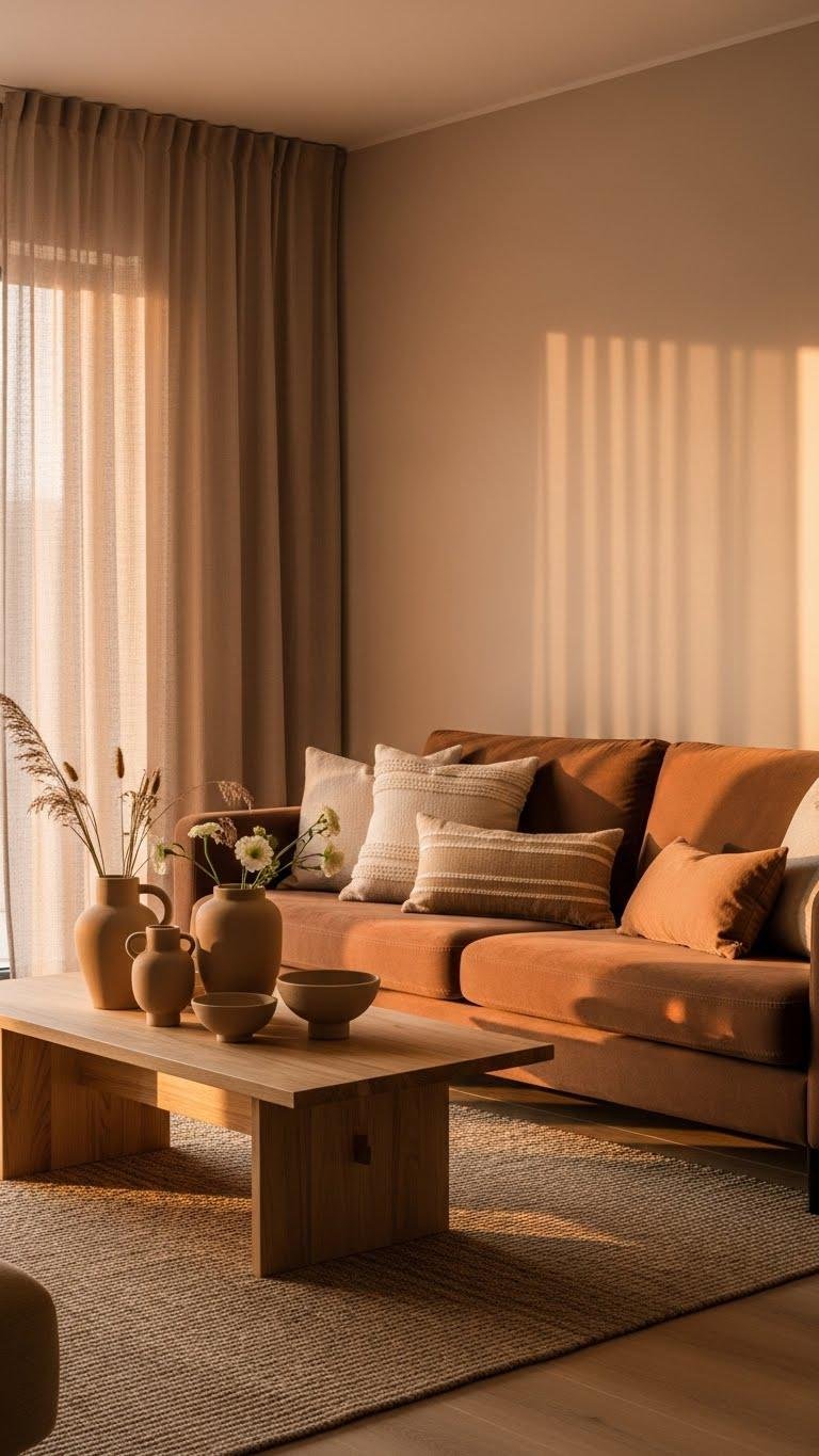 When you layer warm browns over soft beiges, the room feels both grounded and airy. You’ll choose sunset beige walls, textured linens, and a velvety mocha sofa that invites lounging. Natural wood, matte ceramics, and linen curtains keep things tactile and calm. You’ll move freely in uncluttered space, letting light and material speak, creating a serene, unconfined living area.