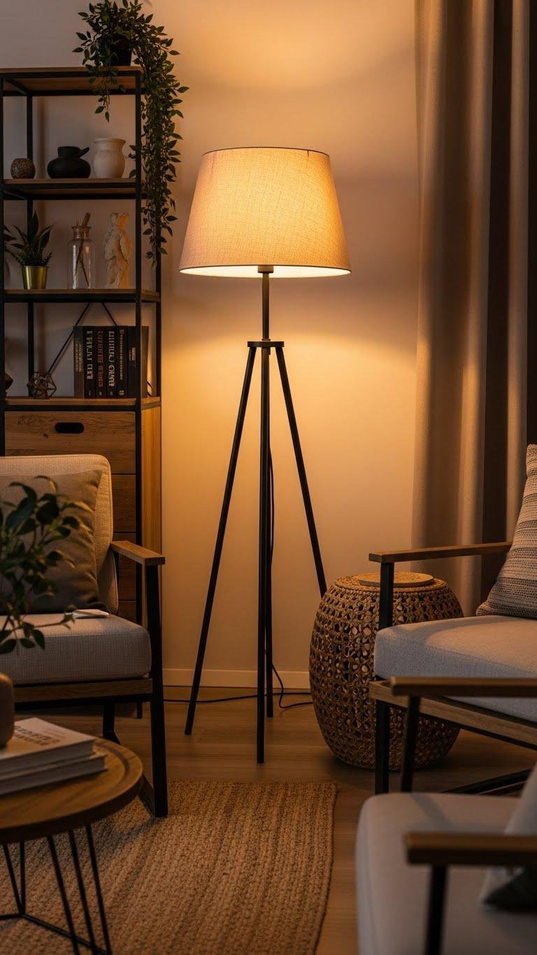 You’ll find that a warm-glow floor lamp with a linen shade instantly softens modern lines, casting a gentle, diffused light that makes materials — wood, metal, woven fibers — read warmer and more tactile.