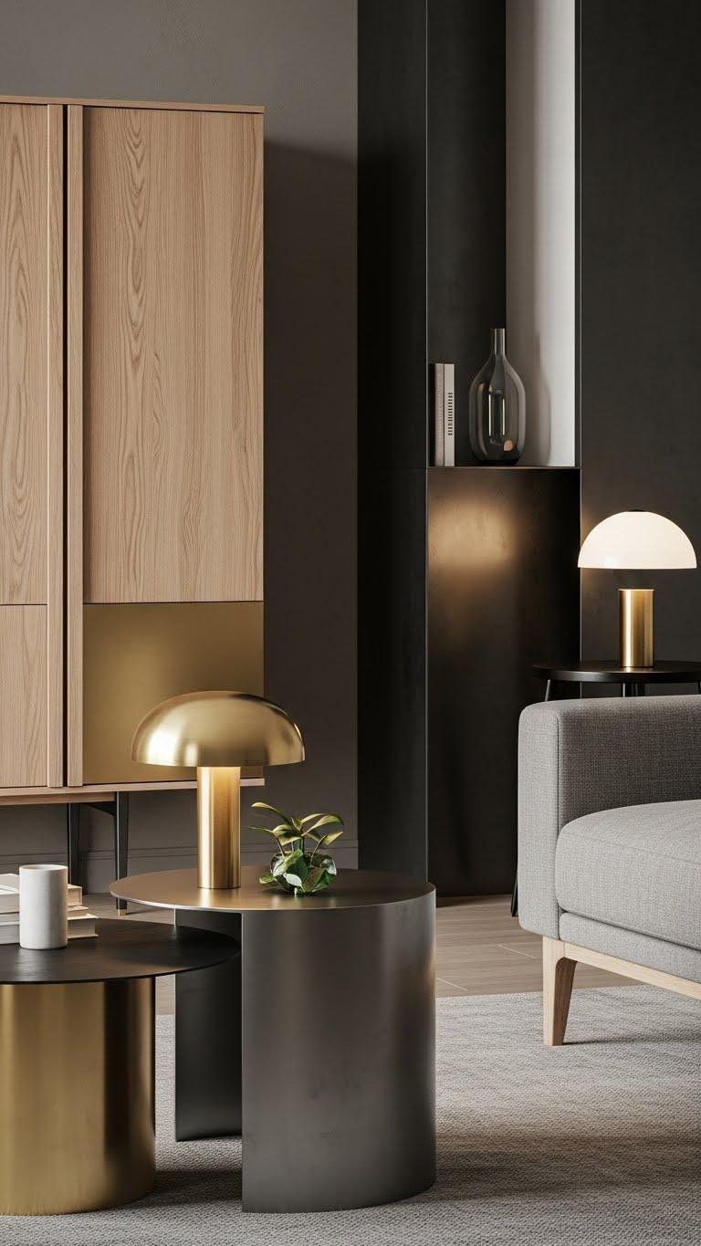 Layering mixed metals with soft wood tones brings warmth and subtle contrast to a neutral modern living room, letting you play with sheen and texture without breaking the calm.