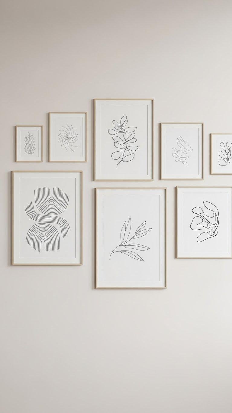 Shifting from mixed metals and soft woods, you can use a monochromatic gallery wall of line art to maintain that calm while adding visual rhythm. Choose matte paper, slim frames, and varied scale to let minimal contours breathe.