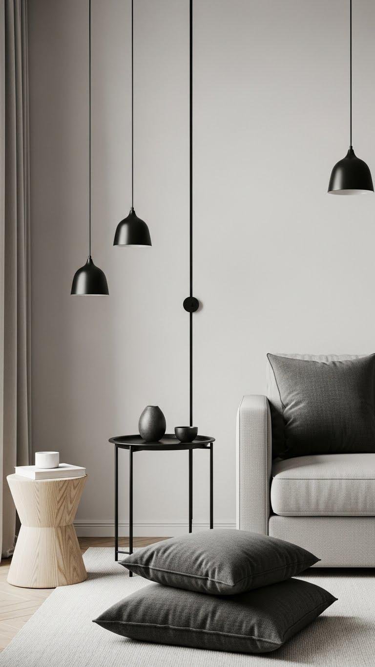 Bring in black accents to sharpen a neutral scheme without overpowering it: small, matte-black elements—lighting, hardware, a slim-legged side table—give definition and depth while the soft palette stays calm. You’ll balance matte black trim with natural woods and linen, place charcoal throw pillows for tactile weight, and let restrained black lines guide sightlines so the room feels liberated, composed, and intentionally pared back.