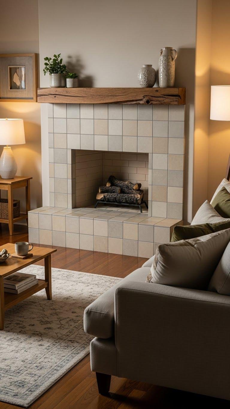 Against warm brown floors, a tile fireplace becomes your room’s tactile centerpiece, its grout lines and surface texture setting the tone for material contrasts. You’ll choose stacked tiles for vertical rhythm and restraint, pairing neutral hues with matte grout to ground the hearth.