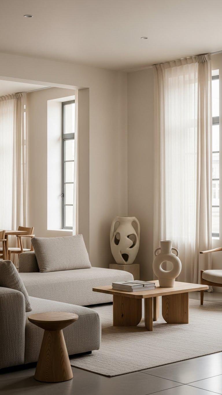 You’ll find ways to calm a room with warm beiges, soft taupes, and tactile layers—linen, wool, jute, matte plaster—and a few deep accents like forest green or amethyst to anchor the eye. Think low-profile sofas, sculptural chairs, reclaimed wood, and matte-metal details that define space without clutter. These ideas pare back ornament and focus on material, light, and circulation—enough to start rethinking your living room’s form and feel.