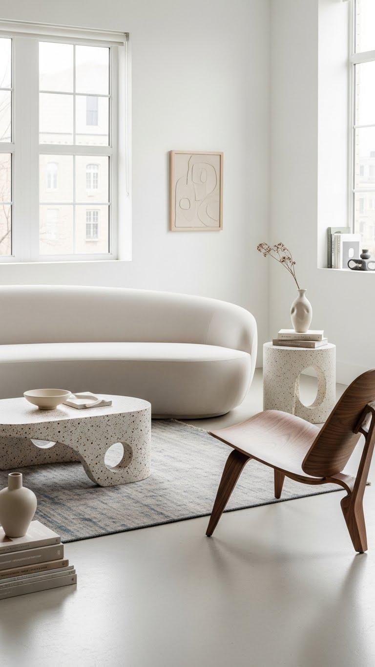 Anchor the room with a single sculptural piece that commands attention—think a curving plaster-backed sofa, an arced walnut lounge chair, or a terrazzo coffee table with organic cutouts—so the eye rests on form as much as function.