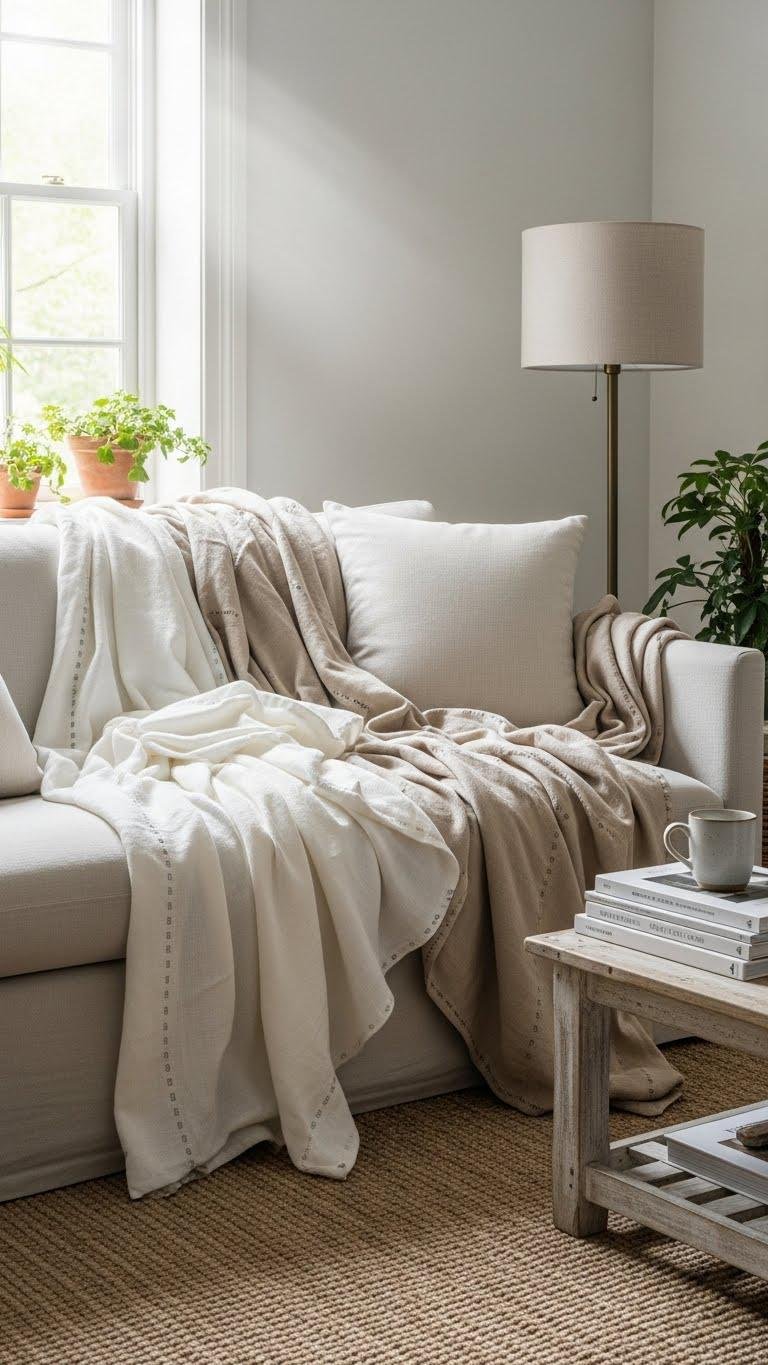 When you drape layered linen throws in off-white and oatmeal over a sofa or chair, they add soft texture and an effortless, modern warmth without stealing the room’s neutral momentum.