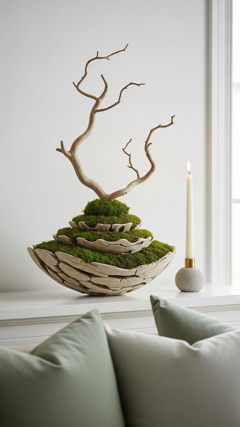 After softening the sofa with muted sage pillows, carry that organic calm up to the mantel with a low, sculptural moss bowl. You’ll pick rounded driftwood or ceramic, layer preserved moss, and add a single sculptural branch for movement.