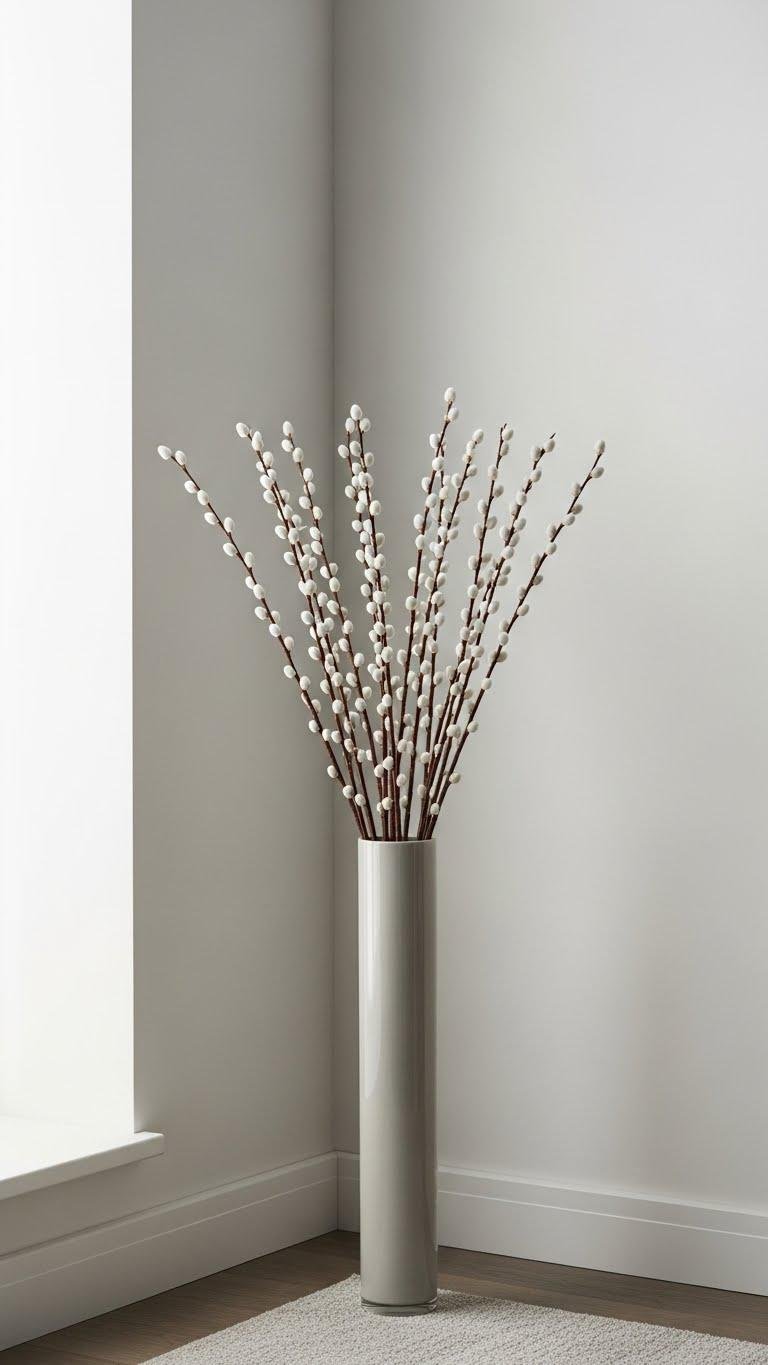 Balance is key: tuck a tall vase of faux pussy willow stems into an empty corner to add height, texture, and soft, tactile blooms without competing with your main focal pieces. You’ll create effortless corner placement that elongates sightlines, offers subtle texture contrast against smooth walls, and feels liberatedly minimalist. Cluster varying stem heights, choose a muted vessel, and let space breathe.