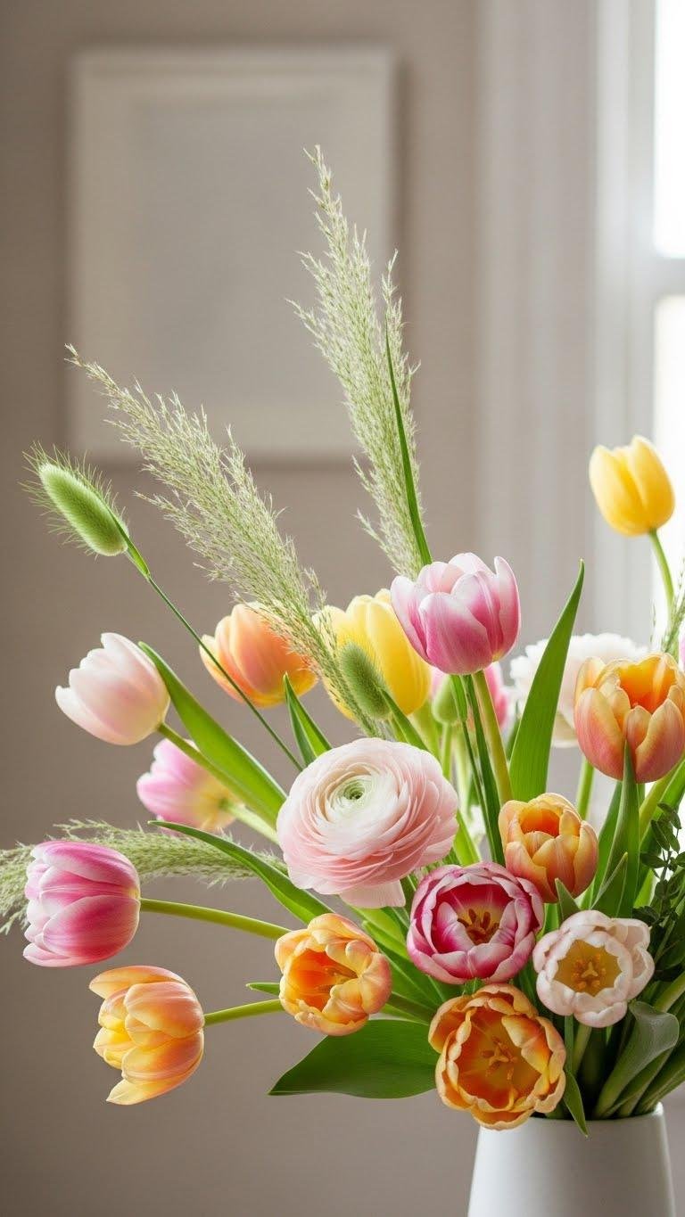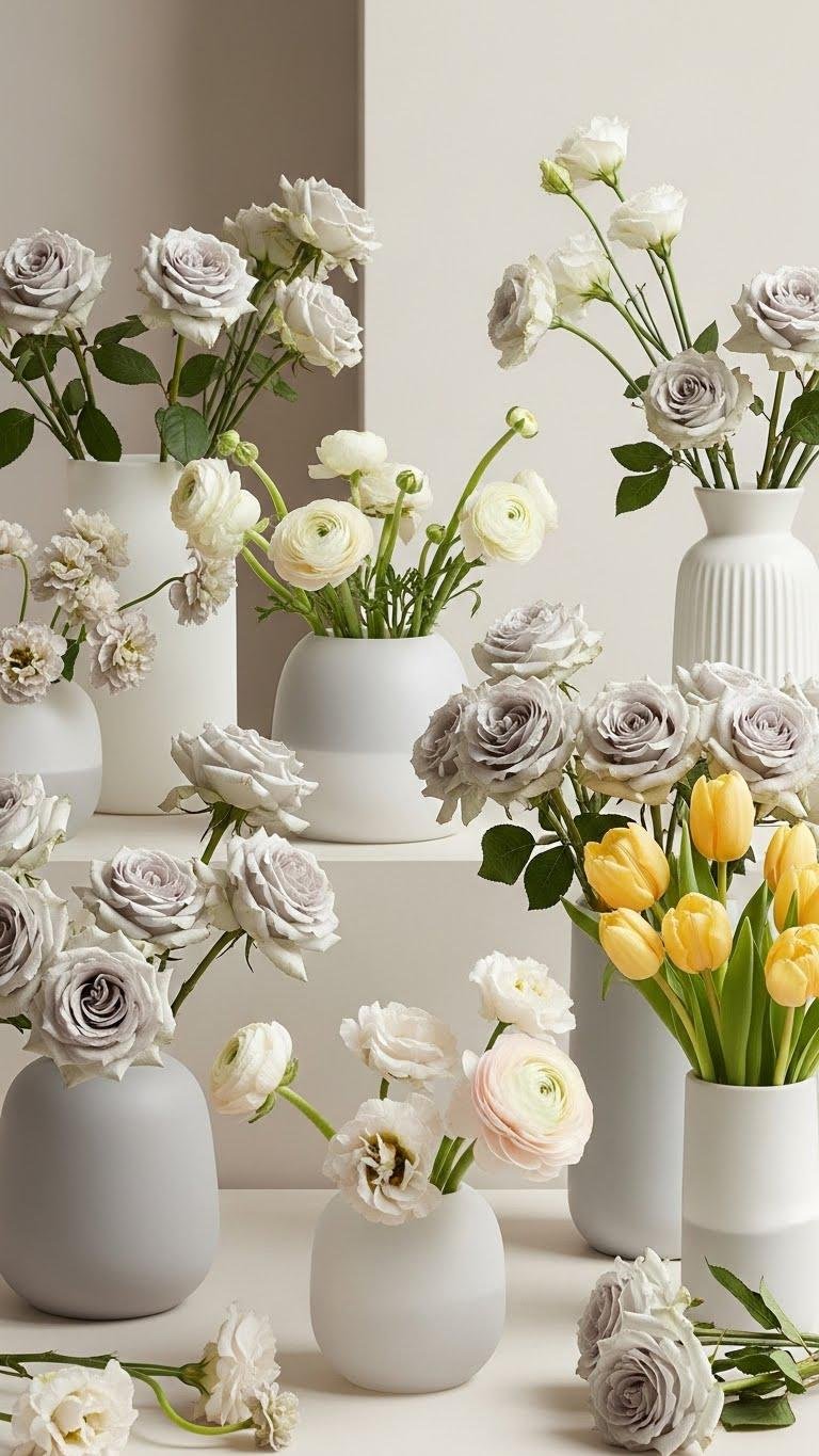 Softening neutral rooms with light-toned blooms in opaque vases lets you add color without breaking the calm: think washed-linen roses, pale ranunculus, and buttery tulips arranged in matte white, soft-grey, or frosted ceramic vessels.