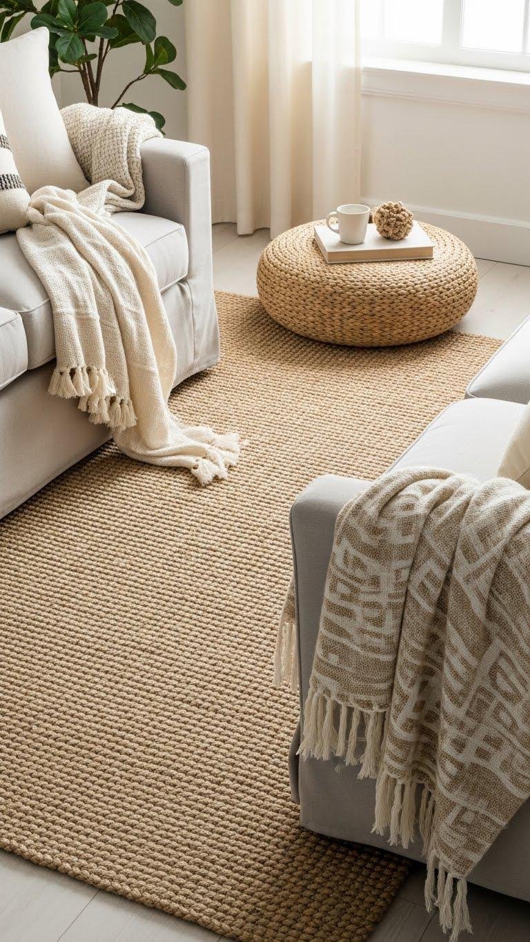 To anchor those soft linen layers, bring in a seagrass or sisal rug — its natural weave adds structure and an earthy contrast to off-white and oatmeal throws. Choose a low-profile rug with coastal texture to define seating and create flow.