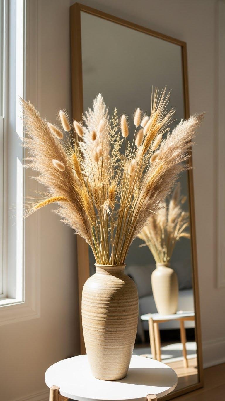 Mirrors amplify light and shape; pair that airy glow with tall stoneware vases filled with dried grasses to add tactile, sculptural warmth.