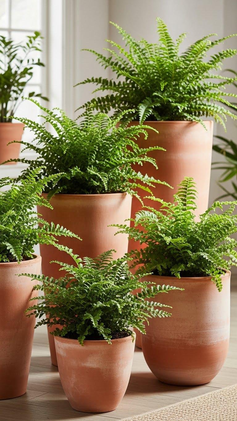 Place varied heights for effortless terracotta staging; let fronds spill over raw clay. You’ll enjoy the relaxed, airy vibe.