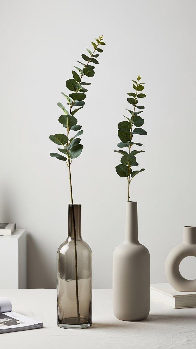 Choose a minimalist vase in matte ceramic or glass, let the eucalyptus scent drift quietly, and keep surrounding surfaces sparse for a freeing, calming display that feels effortless and current.