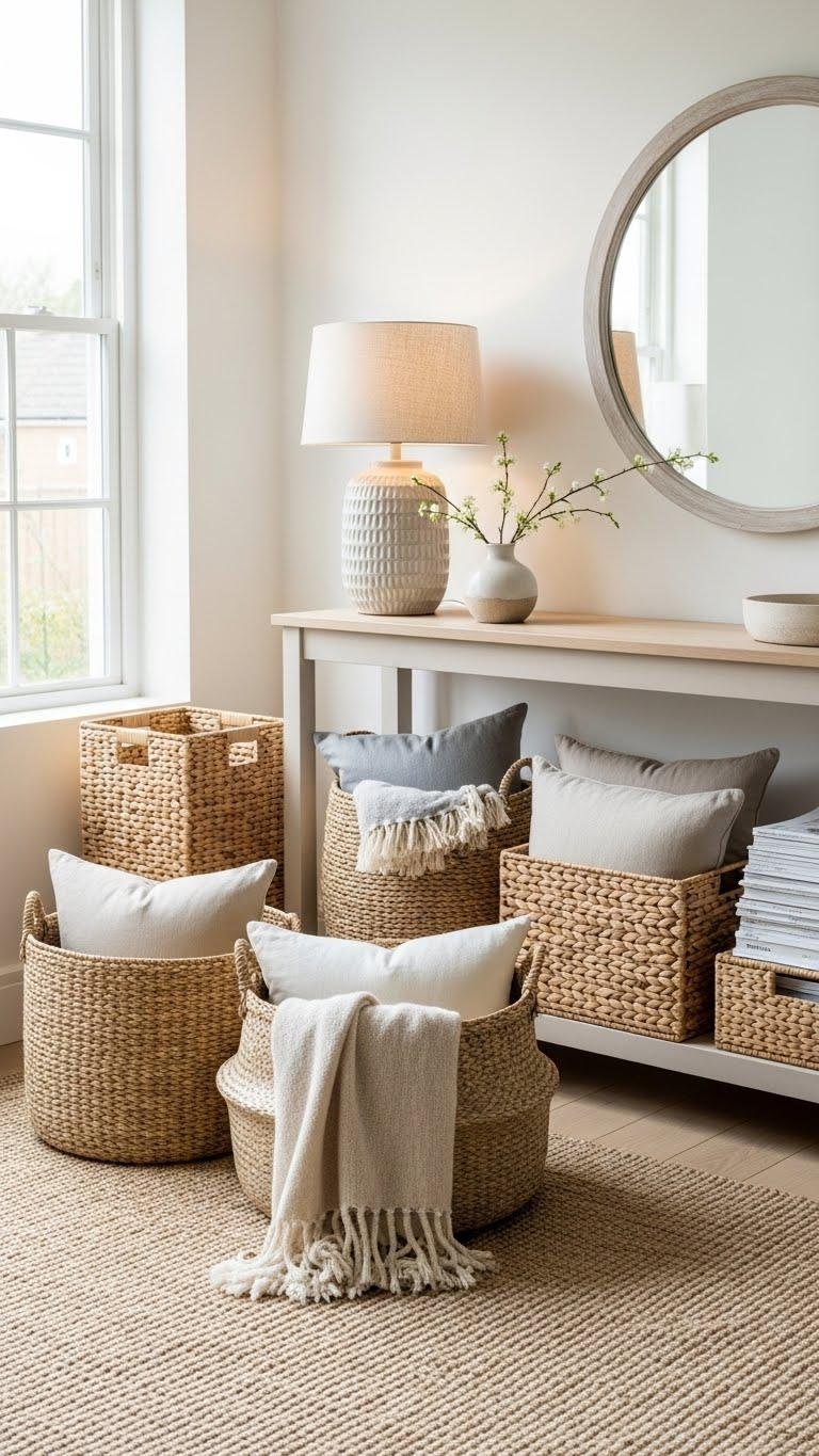 Tuck woven baskets into corners and under consoles to add instant texture and smart storage—you’ll keep clutter out of sight while layering natural warmth into a spring-neutral scheme. Choose varying shapes and heights for woven organization that feels effortless. Use basket layering to create sculptural vignettes, tuck throws and magazines inside, and keep pathways clear so your space breathes and invites movement.