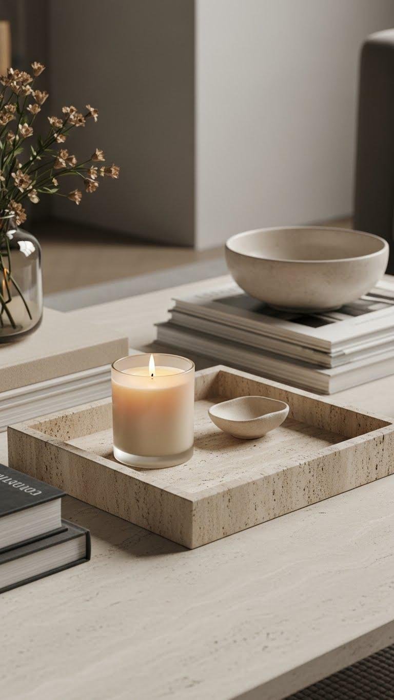 A stone or travertine tray anchors your coffee table with quiet, tactile elegance, giving you a neutral base that’s both stylish and supremely practical. You’ll layer books, a candle, and a ceramic bowl for effortless tray styling; the weight keeps things grounded. Embrace minimal contrast, wipe spills promptly, and follow travertine maintenance tips so your tray stays raw, relaxed, and ready for spontaneous moments.