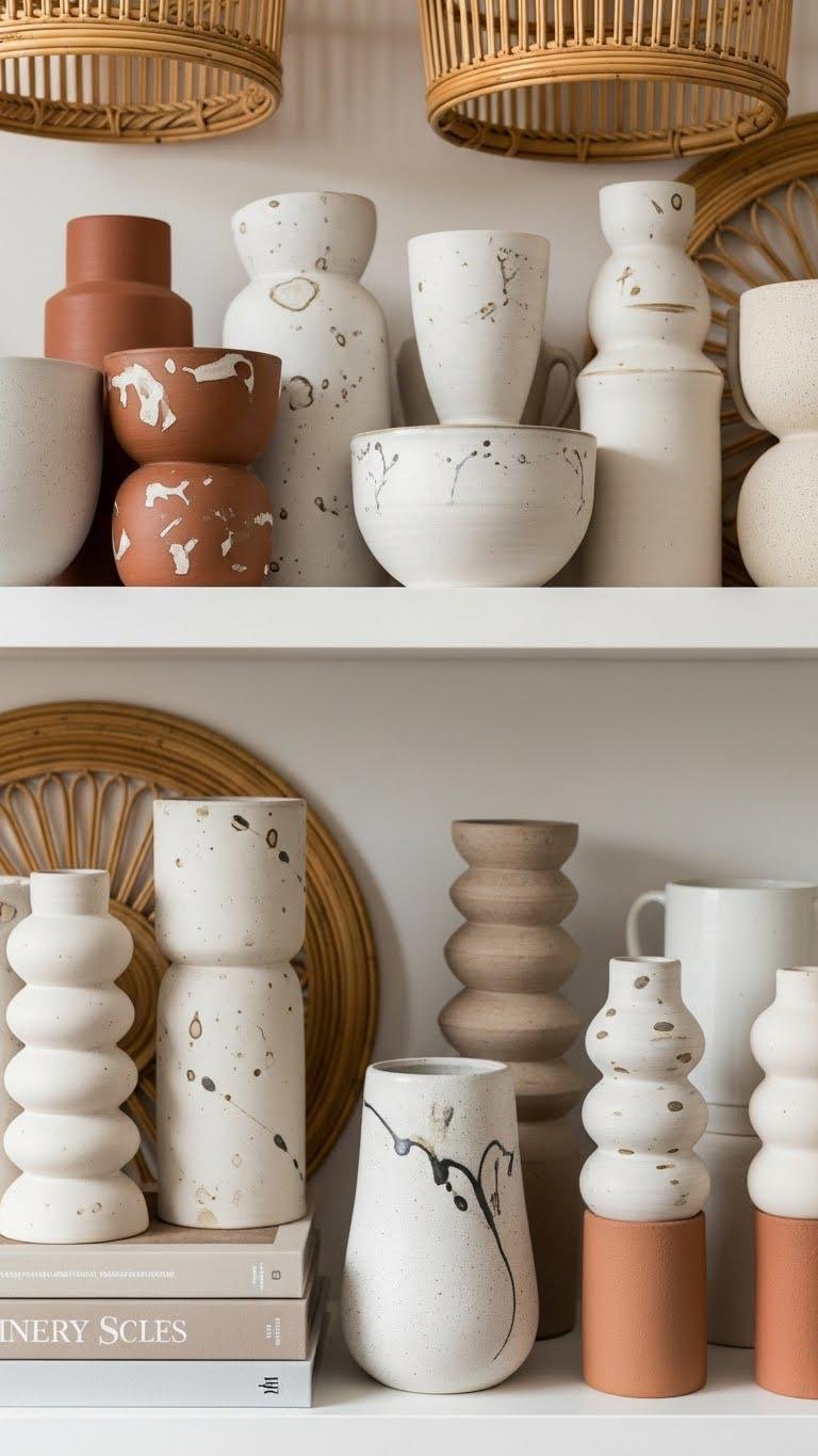 Move the warm, woven mood from rattan fixtures onto your shelves by styling them with unglazed pottery pieces that anchor a neutral spring palette. Arrange varied heights and organic silhouettes, letting matte textures and subtle kiln marks show. Mix open space with clustered vignettes, pair earthen tones with soft neutrals, and choose pieces that feel collected, effortless, and free — curated, not contrived.