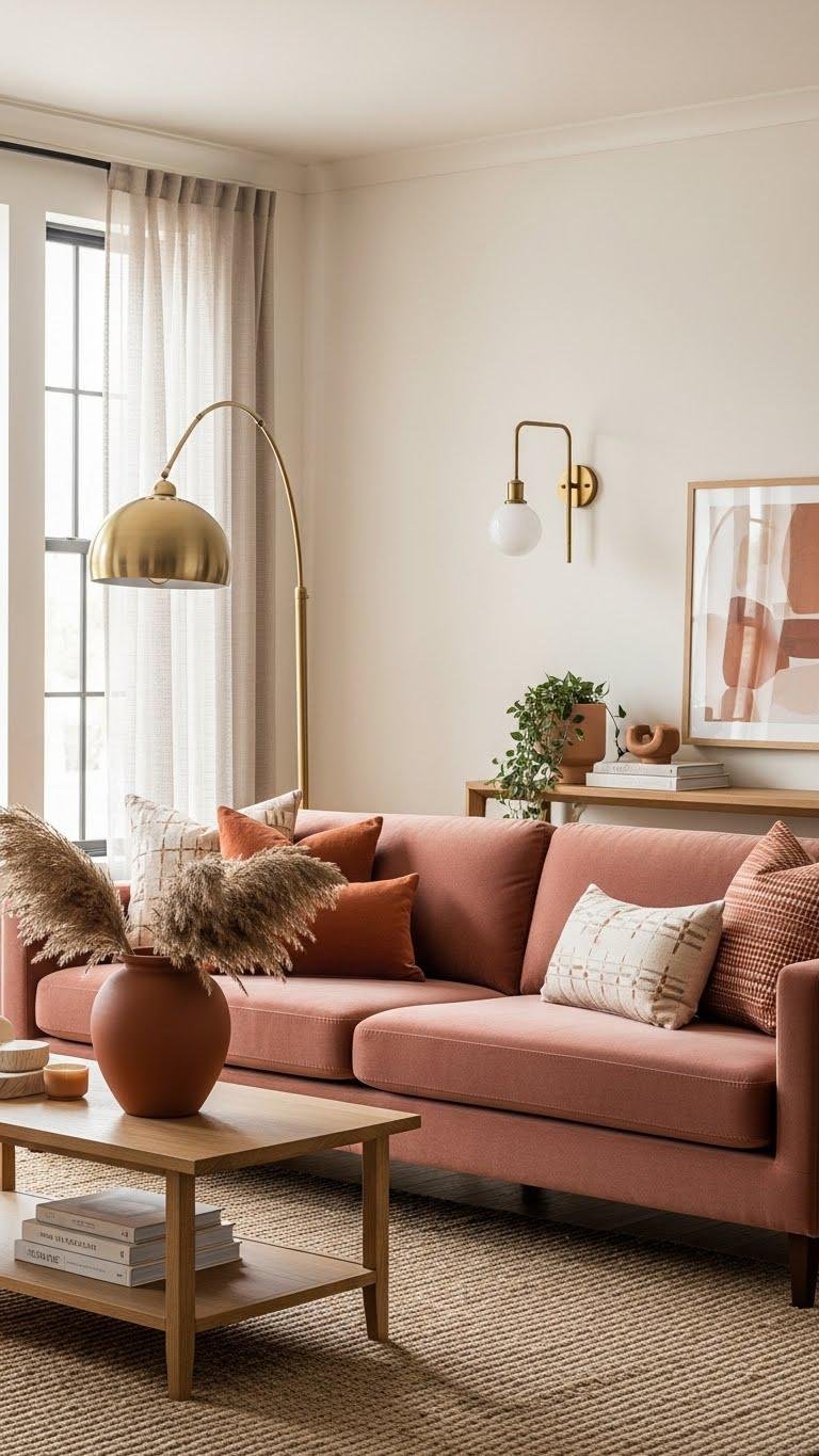 Dusty Rose Sofa Anchoring a Neutral Living Room