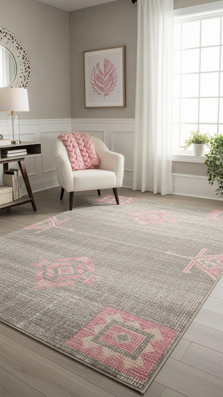 Bring a neutral rug to life with carefully placed pink patterned accents that anchor the room without overwhelming it. You’ll mix a vintage kilim or muted flatweave base with restrained pink motifs, letting a geometric scatter of blush shapes guide sightlines.