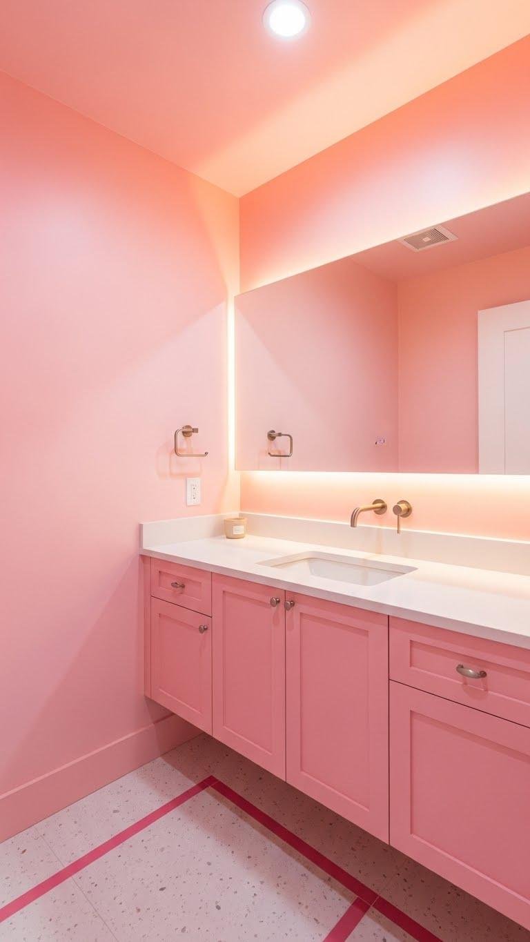 Start bold with bubblegum walls and crisp white fixtures to turn a small powder room into a vibrant, unexpectedly modern vignette. You’ll pick a bubblegum vanity against white terrazzo floors, anchor with pink grout lines, and choose satin fixtures for subtle sheen.