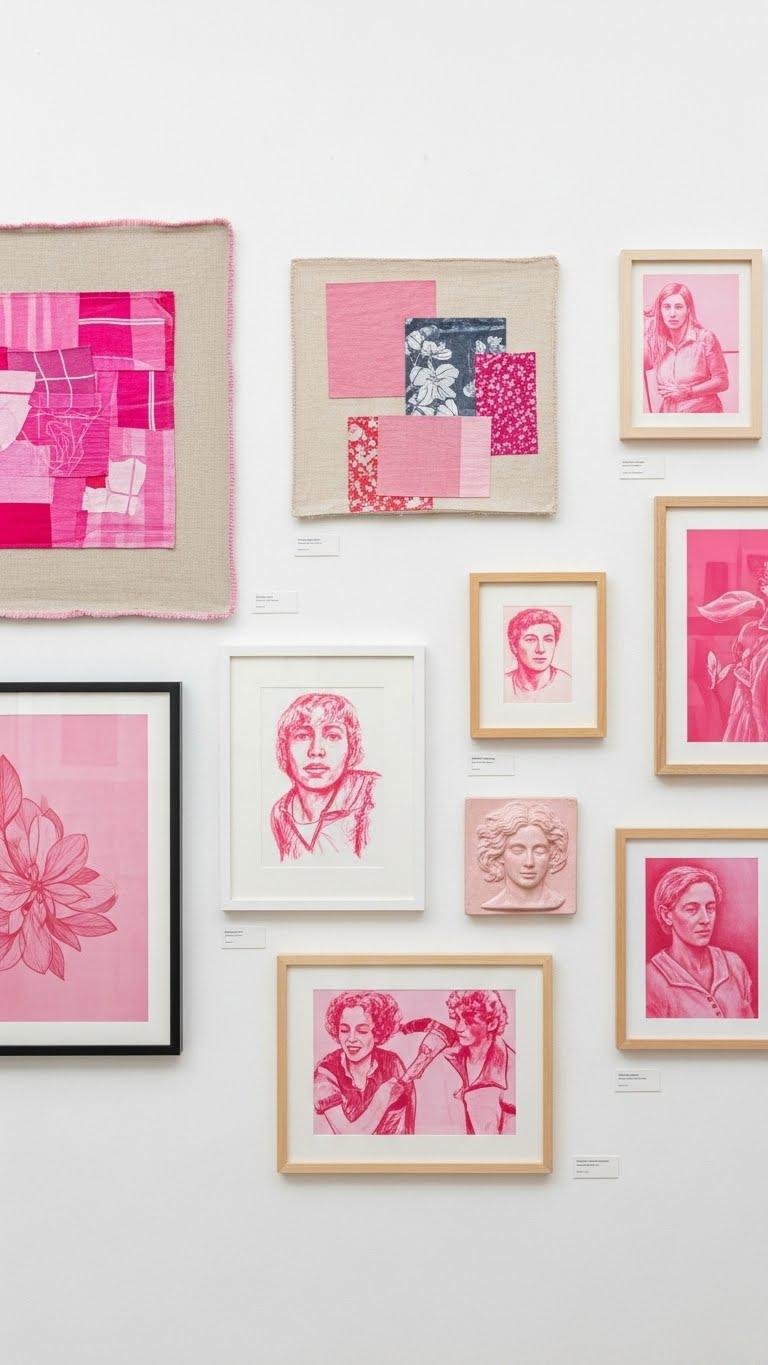 After you establish lighting that flatters your pinks, let the wall take over as the room’s curated focal point: a pink-infused gallery wall with mixed media brings texture and narrative without feeling sweet. You’ll mix linen prints, a fabric collage, ink sketches, and a small ceramic relief for contrast. Keep scale varied, frames minimal, and spacing loose so the display reads confident and free.
