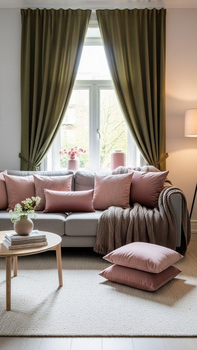 When you layer blush and rose throw pillows on a charcoal sofa, they create a striking yet balanced contrast that feels both modern and inviting.