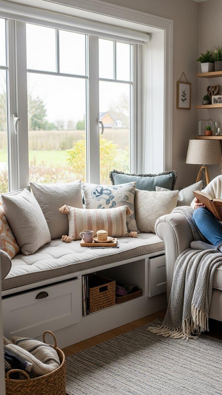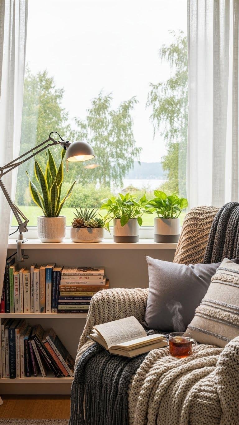You’ll create a comfy seat with layered throws, a focused reading light for dusk, and a small shelf for favorite books.