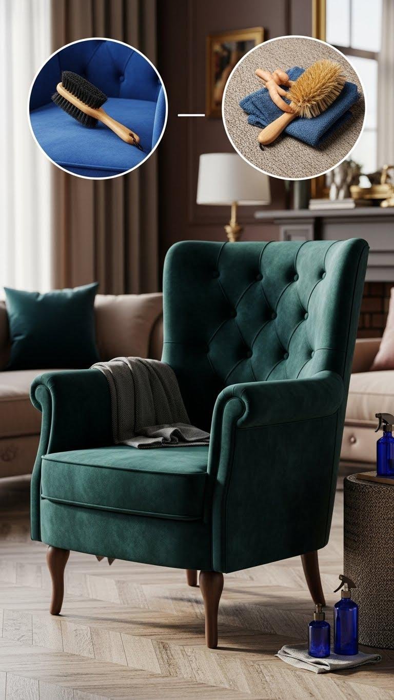You’ll love jewel tufting for vintage charm and silhouette. Place the chair where sunlight hits, pair with a simple throw, and follow velvet maintenance basics—gentle brushing and spot-cleaning—to keep freedom-loving style effortless.
