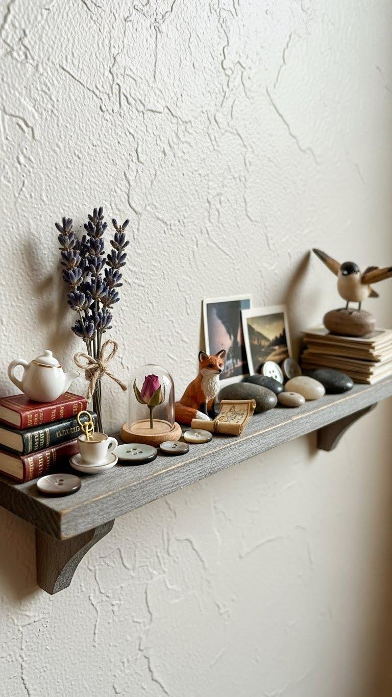 Create a tiny world on a narrow shelf by arranging a handful of miniature objects that tell a story—you’ll add charm without crowding the room. You’ll craft a miniature shelfscape of varied textures and scales, mixing ceramics, tiny books, and botanical sprigs.