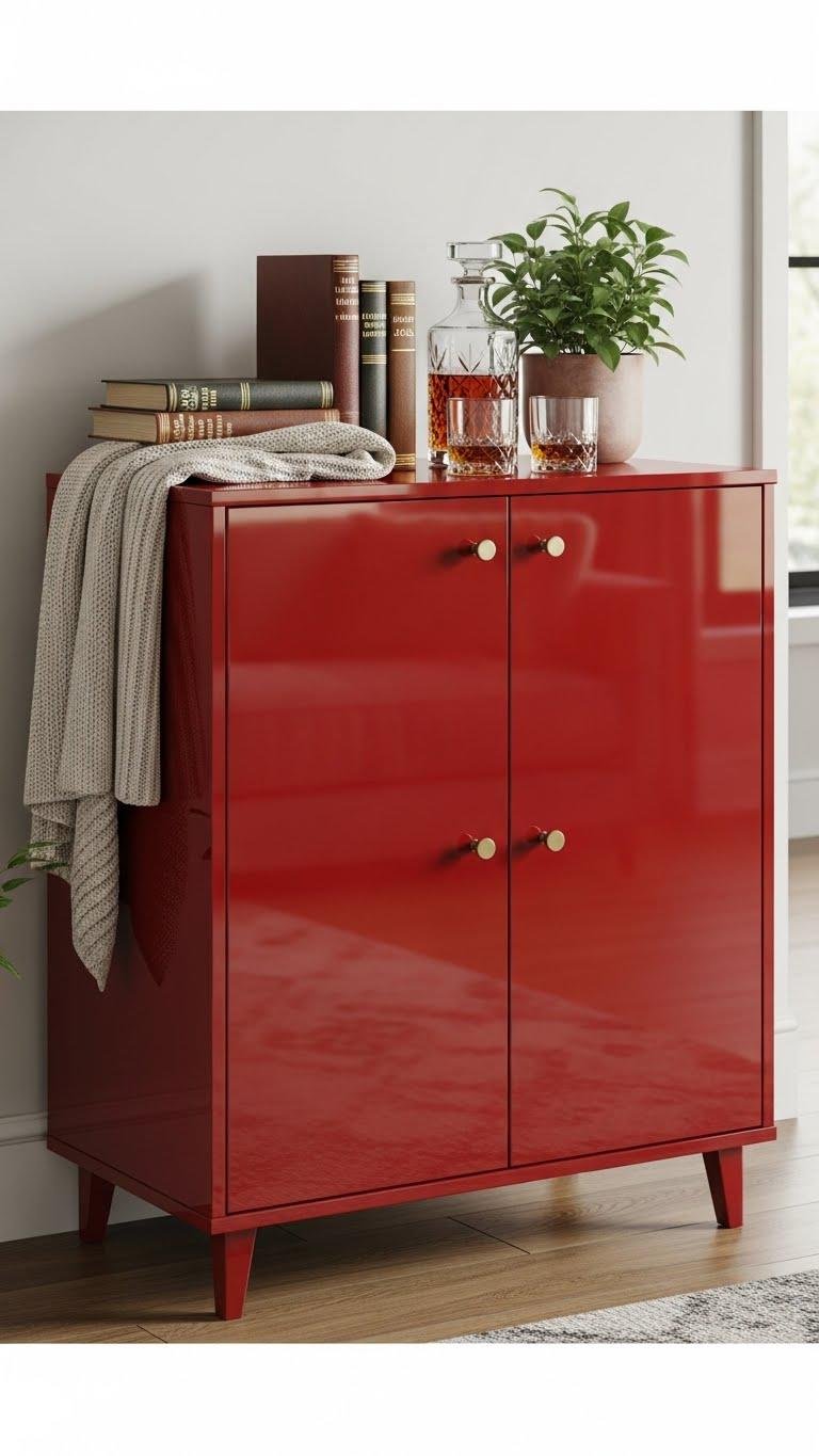 When you want a bold focal point that still feels polished, a high-gloss cherry red accent cabinet delivers instant warmth and personality. You’ll appreciate the high gloss lacquer finish that reflects light and enlarges a room.