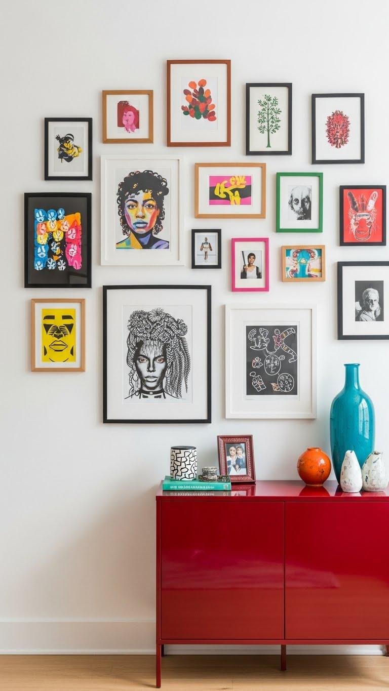 Pair that glossy cherry red cabinet with an eclectic gallery wall to balance bold color with personal storytelling. You’ll mix framed prints, photos, and small objects in mixed medium frames, letting textures and colors roam.