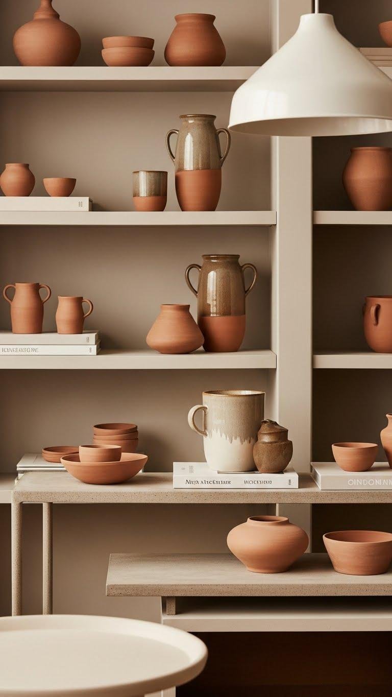 Bring out the gentle warmth of terracotta by grouping soft, matte pottery on open shelving or a low console where their earthy tones can breathe; you’ll create a calm, tactile focal point that feels both collected and intentional.