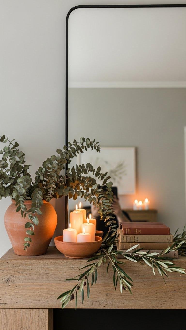 Add textured greenery—draped eucalyptus or faux olive branches—for movement.