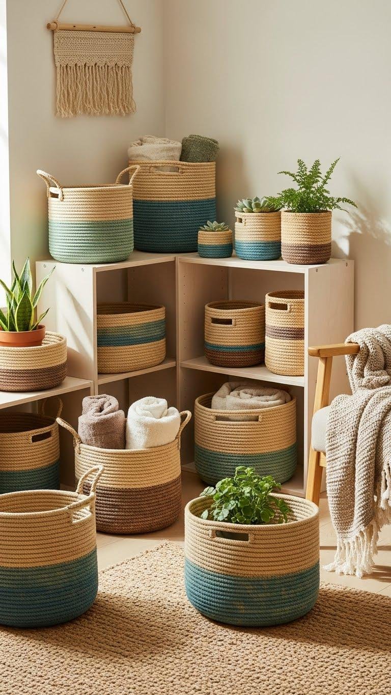 You’ll love upcycled rope and reed baskets for open shelves, trunks, and corners, dyed with biodegradable dyes that age beautifully.