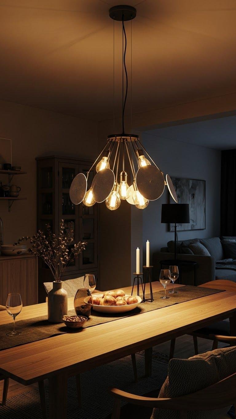 Choose a design that suits a low ceiling or offers adjustable height so you control glow and sightlines. You’ll mix material, scale, and dimming to create an inviting, free-spirited dining space that feels effortlessly curated.