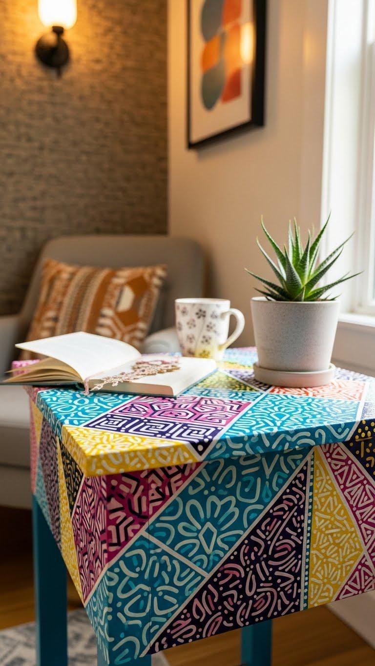 After the pendant sets the mood overhead, shift your eye to smaller surfaces—like a handpainted side table that injects color and personality at eye level. You’ll pick handpainted motifs that speak to you, combine daring hues, and use geometric stenciling for crisp rhythm. It’s practical: add a protective seal, swap styles freely, and let this tiny canvas anchor a room you truly own.
