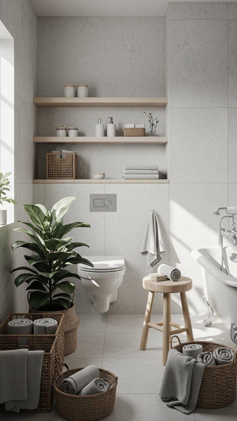 Add a wooden stool, potted greenery, and open shelving so your space breathes and feels free.
